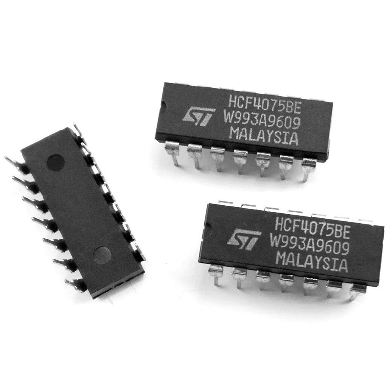 The IC 4075 is a quad 3-input NAND gate, part of the 4000 series CMOS logic family. It contains four independent NAND gates, each with three inputs. This IC is used in digital circuits to perform logical NAND operations, essential for creating complex logic functions, signal processing, and implementing various digital logic designs.