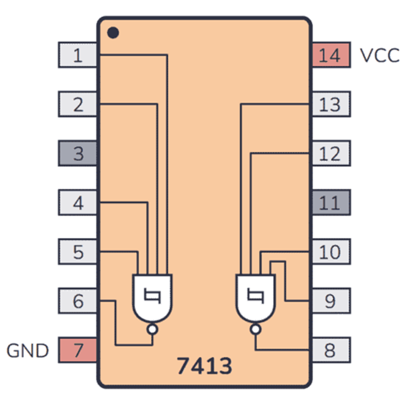 The 74LS13 contain logic gates/inverters which accept standard TTL input signals and provide standard TTL output levels. They are capable of transforming slowly changing input signals into sharply defined, jitter-free output signals. Additionally, they have greater noise margin than conventional inverters. Each circuit contains a Schmitt trigger followed by a Darlington level shifter and a phase splitter driving a TTL totem pole output. The Schmitt trigger uses positive feedback to effectively speed-up slow input transitions, and provide different input threshold voltages for positive and negative-going transitions. This hysteresis between the positive-going and negative-going input thresholds (typically 800 mV) is determined internally by resistor ratios and is essentially insensitive to temperature and supply voltage variations.